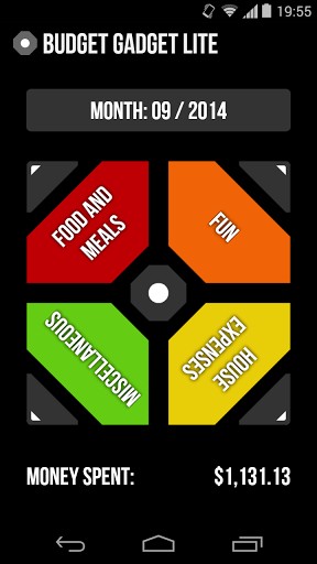 Budget Gadget Lite app for Android has a star trek inspired design. Four bold buttons gives you access to four categories of expenses, the broadest types of expenses one would encounter, namely House Expenses, Food and Drink, Fun, and Miscellaneous. Tap on the required category, and you can enter the expenses in dollar, day of the expense, description of the expense and optionally, the location of the expense. Each of said categories will record a collective ledger wherein you can view how much you are spending on a given category, whereas the clicking on the center button provides a summary of all expenses for the month. The app runs a tally in multiple places to give you the cost. Hence you can have a quick glance of the total expenses from anywhere in the app.