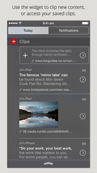 The widget is also chic in that it tries to illustrate as much information in relation to clipped text or images as possible. As Clips is widespread for iPhone and iPad and based on CloudKit, clips are synced across devices with iCloud and they display the source device in the widget. Clips are previewed with bold titles, which is typically the first line of text, two extra lines, and the link of the source app whenever available. Text copied from Safari, for example, will automatically take in the URL of the original webpage even if you did not copy the URL yourself; for email messages, a link to the original message will be attached to the clip, which can be used to see the message in mail. Clips app requires iOS 8.0 or later and is optimized for iPhone 5, iPhone 6, and iPhone 6 Plus.