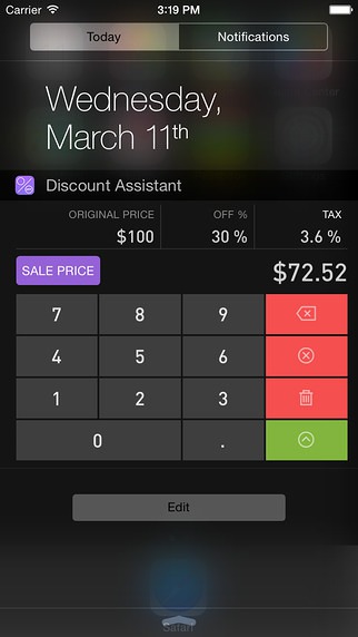 The unique feature of Discount Assistant iPhone app is its inbuilt Today widget which lets a user quickly access all the features of the app without opening it. Apart from this, it supports special keys to clear current input field or clear all input fields in order to start a new session. The most appealing features of the app is to let a user store the discount or a tax rate value in case of iterative nature; so that one need not to enter it repeatedly. There were a few technical issues related to the interface and icon, but are eventually fixed in the most recent version available on the App Store.