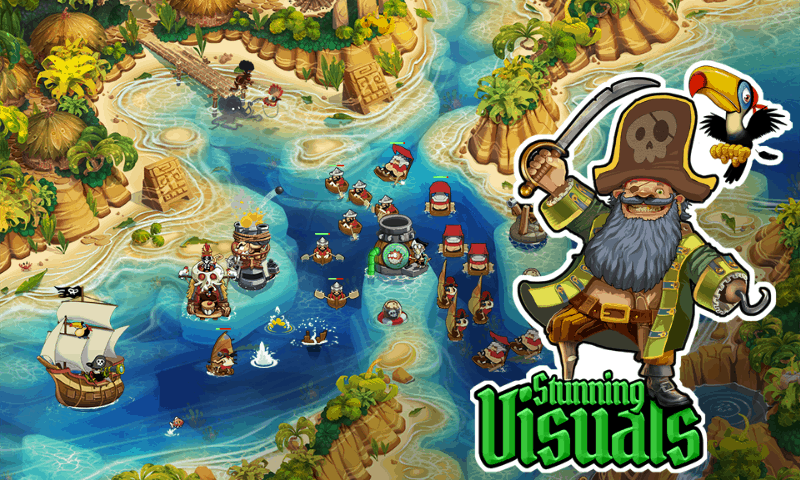 In truth, some elements of Pirate Legends TD app for Android are clearly inspired by its predecessors. But as an overall package, it has managed to look new, thanks to the rip-roaring theme, exceptional animation and satisfying action. Every little thing is animated. For example, even the top games fails to animate sprites when they are inactive even though doing so makes connecting with the game simpler for the player concerned. Pirate Legends TD Android app takes you through many rounds of pirate blasting action. You got to erect towers on floating buoys to prevent the enemies from reaching your pirate ship. You’ll encounter different enemy types and even a sprinkling of bosses that bring welcome difficulty spikes. Another interesting feature is the ability to use the ship you’re defending to attack the enemies. So when the enemies break through your defenses, you can do more than simply watching their march on your base. It is possible to vary the angle of your ship’s fire.