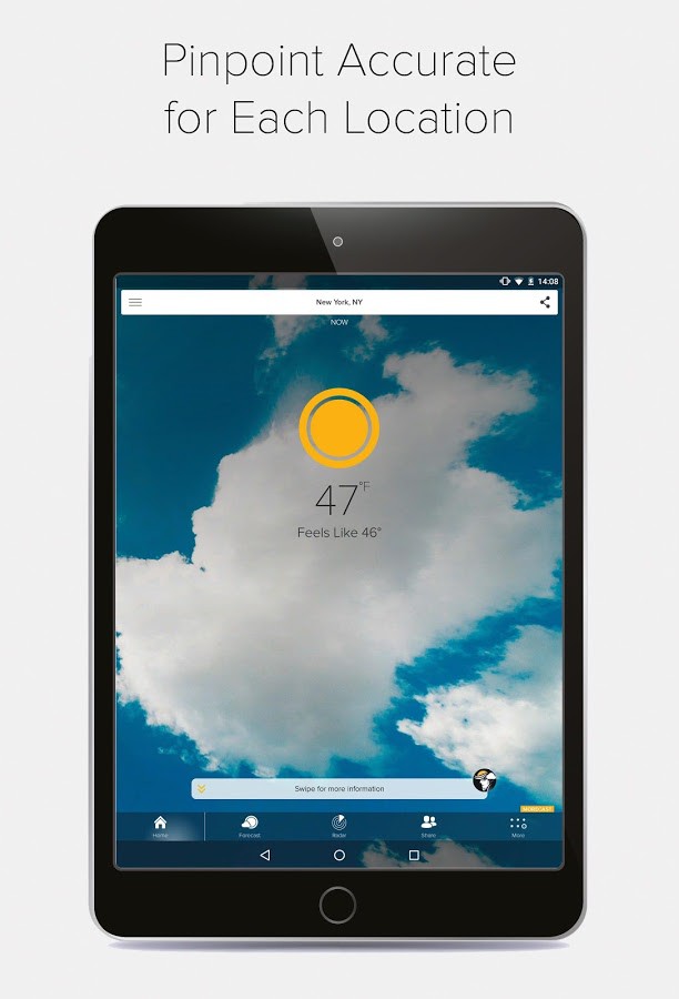 Another great, and potentially lifesaving feature of Morecast is that it allows you to track storm and also gives you the probability for heavy snow and rain and the expected precipitation from those natural phenomenon. You can get information about cloud coverage in percentage on a graph. This feature is greatly beneficial for photographers and other people who want light. Apart from that you can also get sunshine duration and that too for the next 7 days. Morecast USA Weather & Radar tells you about the air pressure in hPa for the entire week. Easy to understand and attractive graphs helps users to understand the weather in a better way. The navigation feature helps to find the quickest way to a place even with the weather changes. You can also compare two cities side by side to get a better idea about the weather condition. You can check a 3D globe of the world that would help you to get knowledge about the weather.