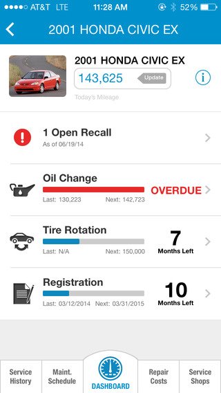 myCARFAX iPhone app provides a simple, clean and idiosyncratic user interface. Once after successful installation, the launch of the app begins with a quick sign up with an email address or Facebook and password. Once done, it permits a user to add up to 5 vehicles either by entering the license number and state or vehicle identification number in order to provide information such as current mileage, registration renewal status, recall info for maintenance and many more. The main dashboard of the app looks pretty and provides relevant information such as oil change, tire rotation, registration renewal status and many more by a line graph that indicates the due date for a user’s attention.