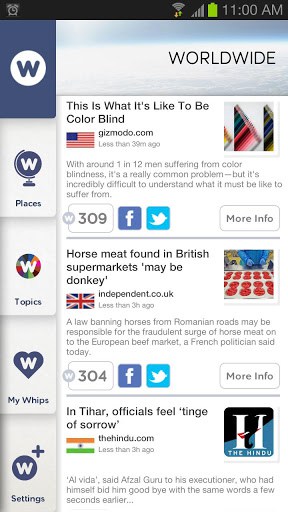 Of course, NewsWhip app for Android got all basic features you’d expect from a news app. For example, you can browse news by topics, if you have specific interests, or browse by place. At the moment, NewsWhip can show you what’s hot now in ten countries, including the US, the UK, Canada, Australia, India, New Zealand and Ireland. You can view your most frequently visited topics in MyWhips. NewsWhip got a pretty and easy to use interface.