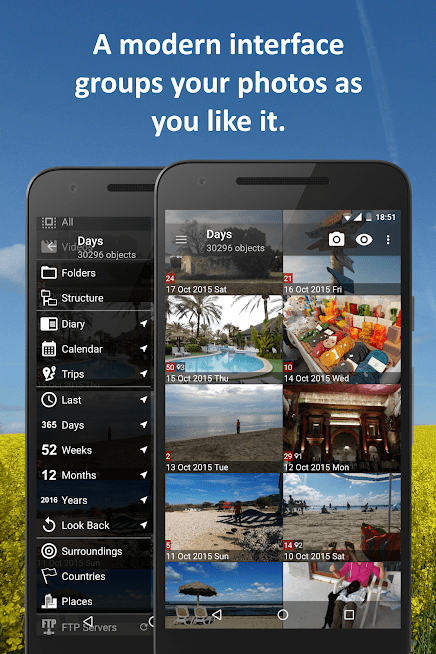 PhotoMap Gallery for Android displays all photos from your calendar in a clear calendar view. The app can also gather photos and videos from the internal storage, SD card and also from cloud storage like Dropbox, Google Drive, Onedrive and so on. The features are plentiful and aid you to track down your memory lane. The integrated geo tracker can jot down all the moments of your everyday life with gps positions and geo tagging. Import and export files in GPX and KML files. Augmented reality gives you an amazing view of the photographs.