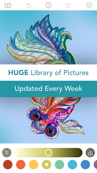 Pigment – Adult Coloring Book provides 11 different kinds of pencils, markers and brushes, and an unlimited number of colors to choose from. To choose your tool, simply click on the button at the bottom of the screen to bring up the color opacity and size sliders, and then tap on the tool button. The app comes with support for 3D Touch and Apple Pencil, so that you can color as you would do with real paper. Of course, you can undo/redo a drawing if you’d made any mistakes. If you’re bored with a design but are not yet finished, just go back to the library and pick another one. The current one will be saved in My Work. Once done, the creations can be shared via social networks.