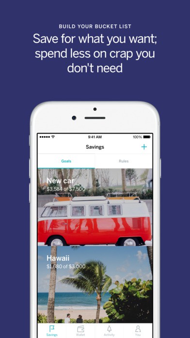 Downloading Qapital for iPhone and setting up an account takes two minutes. Your Qapital account is FDIC-insured and uses bank-level security to keep your money and data safe. The app helps you save money with goals you create. Then attach a rule for each goal to help you save such as putting away a specific amount every week. You can attach your bank account or a funding account, and sit back and watch as the money you save for your goals roll in. There are default goals that you can select and add how much money you need for it. If none in the listing are fitting your needs, you can create a custom goal. Some of the default listed rules include The Round-Up Rule, Spend Less Rule, Guilty Pleasure Rule and 52-Week Rule. Further, you can add an inspirational cover photo and select whether the goal is for you only, or for another person as well. That is, you can add a member to your goal from your contact list so that you can work on it together. The best part is that Qapital does not require any fees or minimum deposits.