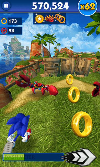 In Sonic Dash game there are no levels or mission to complete; you need to climb your way up the leaderboards in your friends list. Every run in the game ends with you jumping over an obstacle and immediately landing on an unexpected enemy. Sonic never dies in this game but if he hits the wall he will instantly lose the run. At each obstacle you will be asked if you want to spend on a premium ring to continue. Any standard ring you collect can be stored or banked during the run and spent afterwards to boost Sonic. The boosts available are head starts, ring magnets and a super dash boost. You will encounter two environments in the game, the Green Hill Zone and the Seaside Hill Zone. If you keep doing all the challenges, you don’t need to purchase anything for that extra boost.