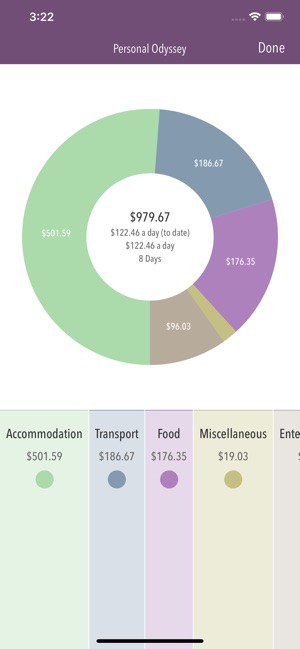 Trail Wallet iPhone App calculates how much you can spend each day. Manage multiple trips with customized start and end dates. Tag the amounts. Use home currency or over 218 foreign currencies. Find the latest exchange rates. Easily spread the days spending to other states and manage expenses based on that. Have visual view of how much you spent on each category. It has comparison on how the current trip fared against other trips so you can make an informed decision.