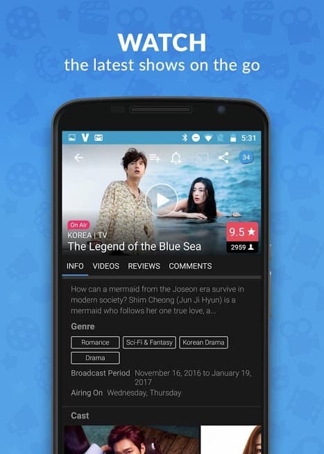 Viki: TV Drama & Movies for Android is a community based application where in fans of the app around the world interacts, review and give useful comments. There are subtitles in 200+ languages provided by the fans for each shows. It is completely legalized with no bad streaming, downloads and viruses. You will never feel alone as you can chat with other users as you watch shows on Viki. You can check ratings and reviews before watching the shows. Also, share your reviews and ratings with other users. Collections will have shows and videos curated for you by the staff and users. You can explore the library for popular genres like romance and thriller. You can subscribe to Viki Pass Standard for a superb HD experience.